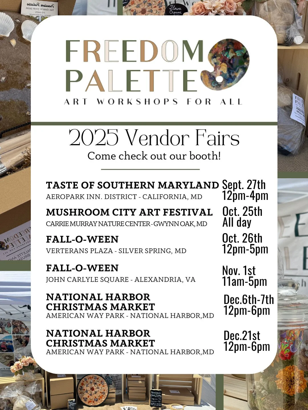 Your donations will go towards providing free art workshop events in the Southern Maryland, DC, and Baltimore areas.